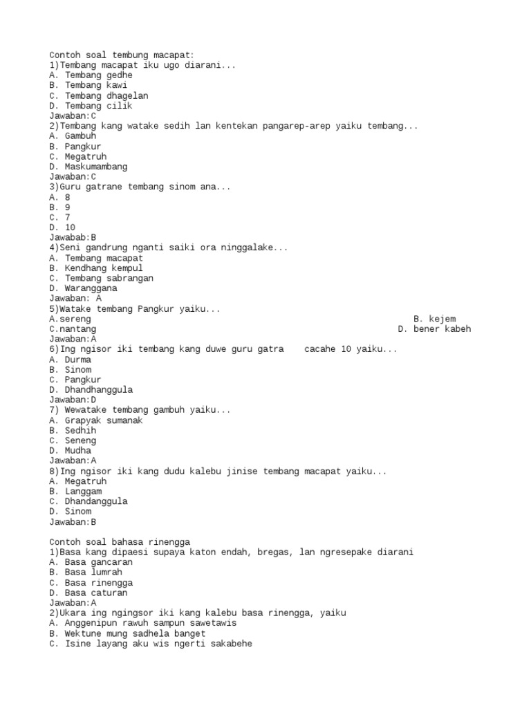 Angobori kang peteng, ambabati kang rungkud e. Ukara ing ngisor iki kang nggunakake basa rinengga yaiku. Ukara ing ngisor iki kang tetembungane ngemu teges ora salugune yaiku. * 5 poin aja mangan ning ngarep lawang isine layang aku wis ngerti sakkabehane kekaron kinanthi manjing ing sasana rinengga anggenipun rawuh sampun sawatawis wektune sedhela banget Ukara ing ngisor iki kang kalebu basa rinengga yaiku. 3 basa rinengga ing ngisor iki gawenen ukara sing trep karo tegese kaya tuladha tuladha polahe. Utawa b asa rinengga yaiku karangan kang kalebu susastra rinacik mawa basa kang endah. Aja dicedhaki dhisik, saiki dheweke lagi abang kupinge amarga bubar kelangan dhuwit ing pasar. Tembung aran kunci jawaban:b 18. Basa kang endah/penak dirungokake d. Basa artinya bahasa sedangkan rinengga artinya yang dihias. Ukara ing ngisor iki kang ngemot tembung entar yaiku. Adhedhasar jinise, tembung basa jawa bisa dibedakake dadi sepuluh, yaiku :